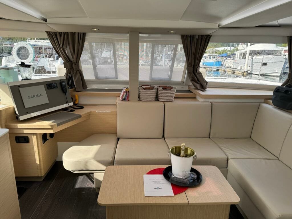 The salon features comfortable seating, a storage coffee table, and a second navigation station with a Bluetooth stereo.