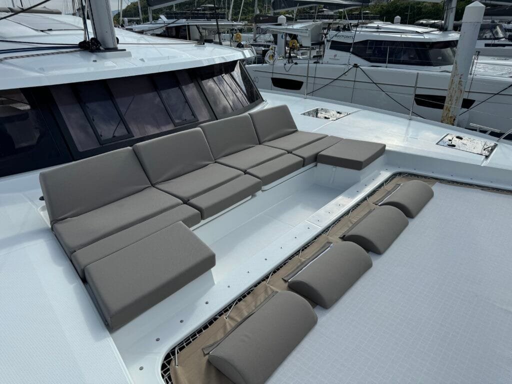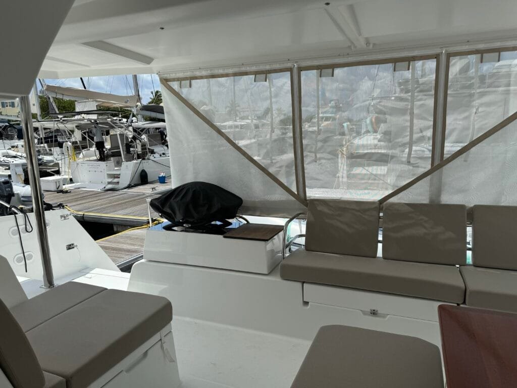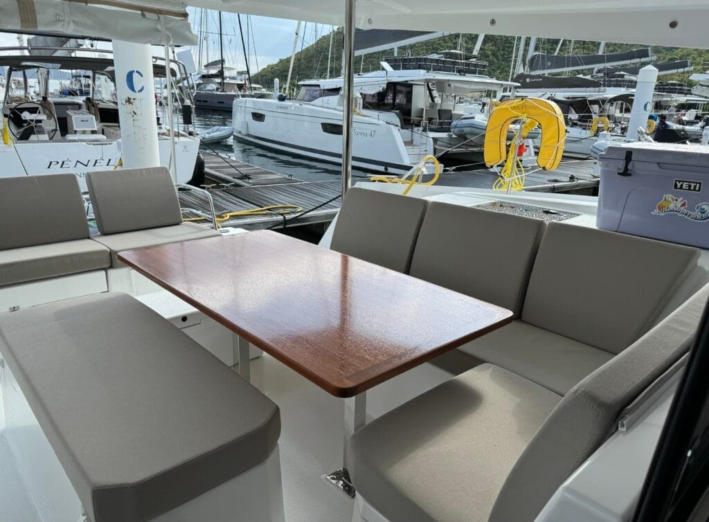 There is ample seating for meals, games, or enjoying the sunset. The cockpit includes a beverage fridge and two coolers for ice and drinks.