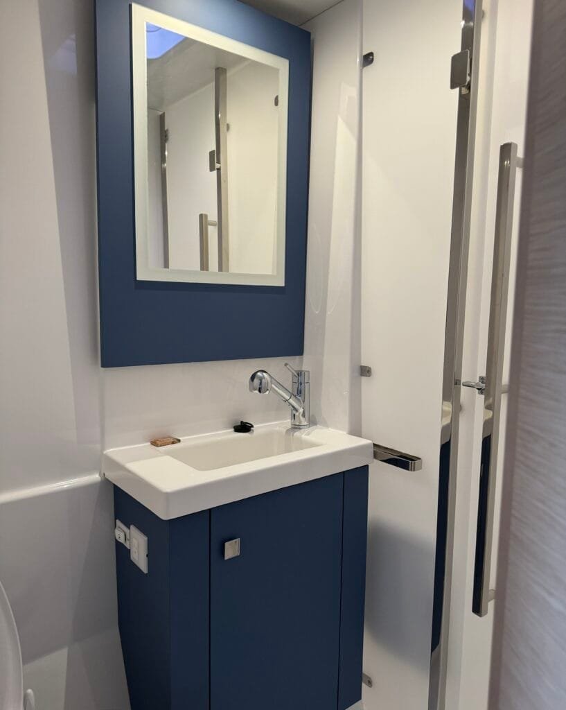 The galley includes a gas stove, convection oven, full freezer, and a faucet for ultra-purified drinking water—eliminating the need to store bottled water.