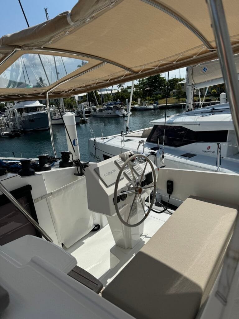 The Bimini-covered helm keeps the captain shaded and includes a navigation station, radio, and an electric winch for easy mainsail raising.